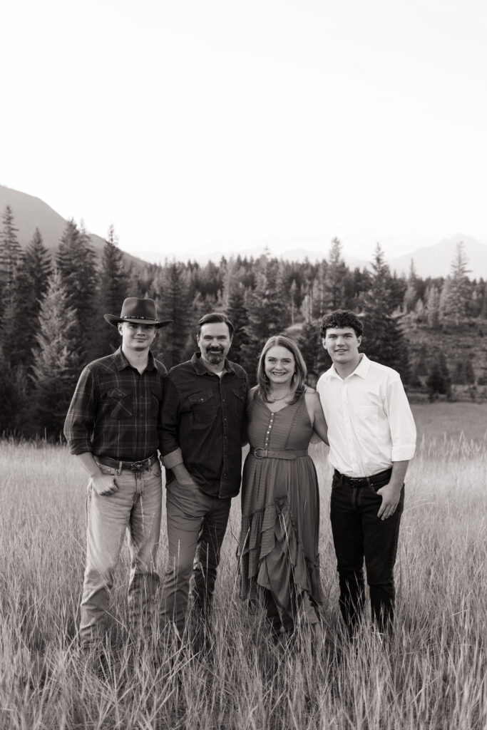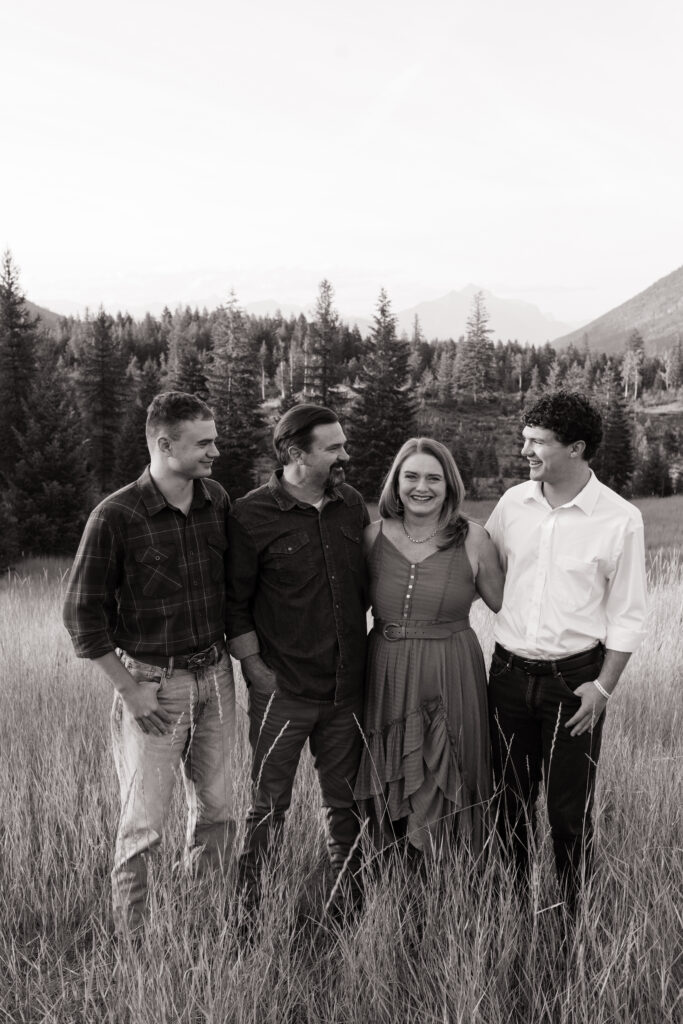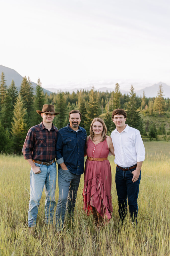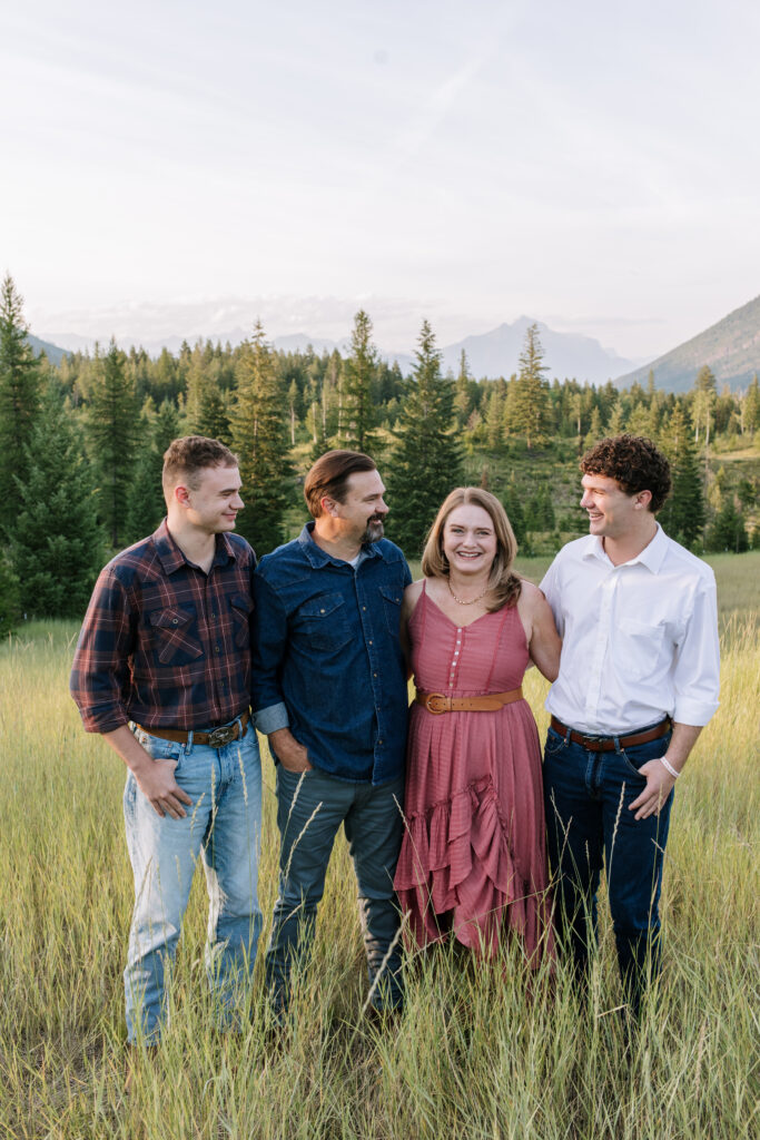 The boys walked through the grass, joked with each other, and their parents joined in for relaxed family photos. With the mountains in the distance and the soft evening light coming through the grass, everything felt calm and natural.